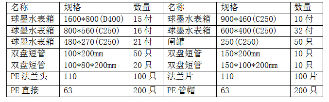 1、采購內(nèi)容:球墨水表箱、雙盤短管、閘罐、PE法蘭頭、PE直接等