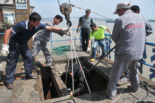 如圖:潛水員下到閘門井底查檢平板閥門封閉情況。