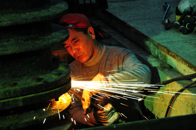 如圖:檢修人員正在拆卸取水機(jī)組進(jìn)水閥門。