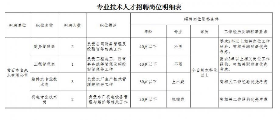 報(bào)名者應(yīng)符合《黃石市自來水有限公司專業(yè)技術(shù)人才招聘崗位明細(xì)表》(以下簡(jiǎn)稱《崗位表》)規(guī)定的年齡、專業(yè)、學(xué)歷等各項(xiàng)要求。
