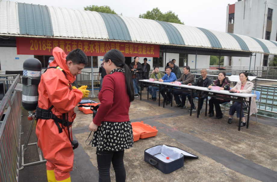 當天上午,首先在公司二樓會議室舉行了“職工技能比武”理論考試。公司領(lǐng)導(dǎo)高度重視,現(xiàn)場巡視??荚囘^程中,參考人員和監(jiān)考人員嚴格遵守考試紀律,參考人員答題認真,監(jiān)考人員監(jiān)考嚴格。在下午的實操考試中,共分為運行值班工比賽、維修電工比賽、水質(zhì)檢驗工比賽以及防化服穿戴等四個項目。其中,水質(zhì)檢驗工比賽主要測試職工水質(zhì)檢驗工基本理論知識和水質(zhì)日常檢測七項、九項指標基礎(chǔ)理論知識。維修電工比賽需根據(jù)安全技術(shù)操作規(guī)程完成試題要求。運行值班工比賽以現(xiàn)場答題的方式,回答評委提出的問題。防化服穿戴比賽,要求兩人一組相互配合,根據(jù)防化服穿戴規(guī)范程序在規(guī)定的時間內(nèi)正確完成穿戴。