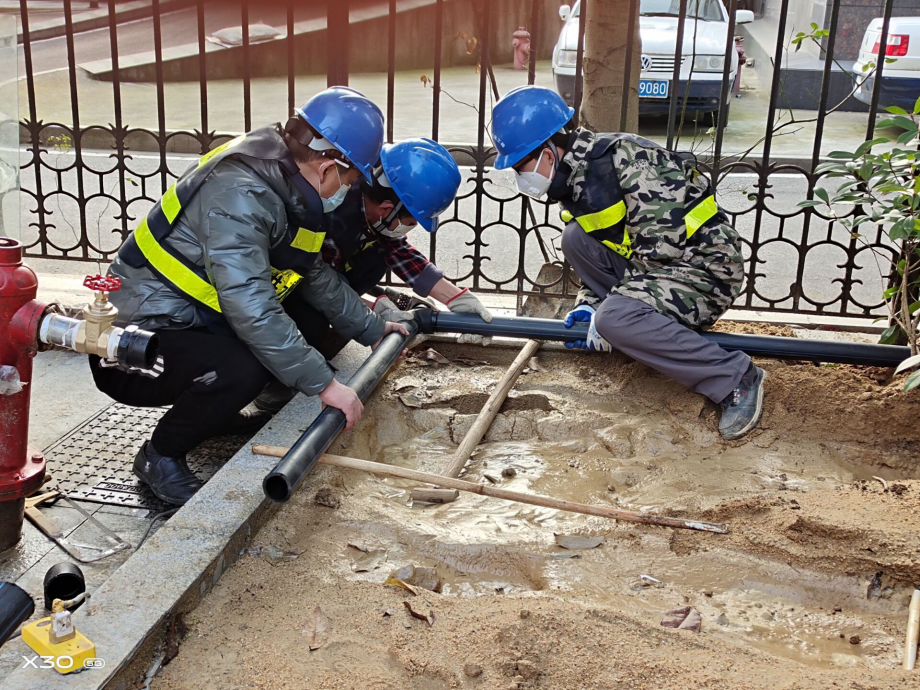 2月3日,公司接到緊急任務(wù),我市新型冠狀病毒肺炎疫情防控指揮部將新建臨時(shí)食堂,需盡快連通用水。疫情當(dāng)前,速度就是生命。為保障防疫指揮部后勤工作,當(dāng)天,市自來水有限公司迅速安排客服中心、設(shè)計(jì)公司以及建設(shè)工程公司相關(guān)負(fù)責(zé)人趕赴現(xiàn)場(chǎng),特事特辦,三個(gè)部門現(xiàn)場(chǎng)進(jìn)行勘測(cè)設(shè)計(jì)、制定方案并迅速組織材料施工,僅5小時(shí)便完成外部敷設(shè)供水管道96米、安裝閥門2臺(tái),具備了通水條件。根據(jù)指揮部計(jì)劃要求,待食堂其他建設(shè)項(xiàng)目完工后,工程公司后續(xù)將完成食堂內(nèi)外管道對(duì)接和排水管道的敷設(shè),保障防疫指揮部食堂最快時(shí)間正常通水。