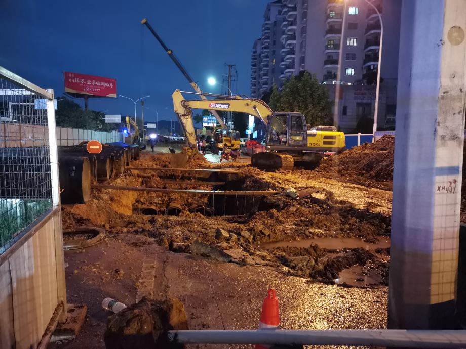 由于天氣等客觀因素,項目部前期已組織施工準(zhǔn)備,確保機(jī)械、材料、圍護(hù)等設(shè)施充足,人員現(xiàn)場待命克服雨天困難破路施工,主干道分流后機(jī)械進(jìn)場破路開挖,管道安裝成功迅速完成路面恢復(fù),最大程度降低對市民出行帶來的不便,確保市民假期末回城高峰及節(jié)后上下班正常通行。