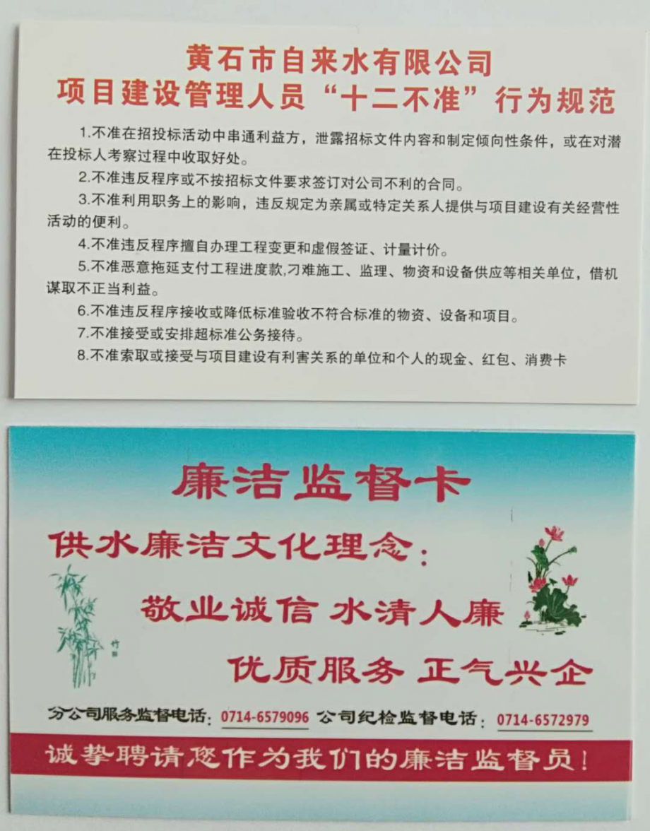 送廉助廉:到建設(shè)工地發(fā)放《“十二不準”行為規(guī)范》廉潔小卡片,向落戶企業(yè)送《供水服務(wù)廉潔監(jiān)督卡》,與經(jīng)濟合同雙方協(xié)簽定《廉潔共建協(xié)議書》,同職工家屬簽訂《家庭助廉協(xié)議書》,共建廉潔防線。